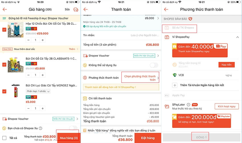 Nếu đây là lần đầu bạn sử dụng, hệ thống có thể yêu cầu bạn thiết lập mã PIN cho ví Shopee (hiện được gọi là số dư trong tài khoản Shopee). Sau khi chọn phương thức và nhập mã PIN xác nhận, số tiền tương ứng với giá trị đơn hàng sẽ tự động được trừ. Lưu ý rằng số dư tài khoản Shopee chỉ có thể dùng để thanh toán các đơn hàng trong nước và số tiền trong ví của bạn phải lớn hơn hoặc bằng giá trị đơn hàng.