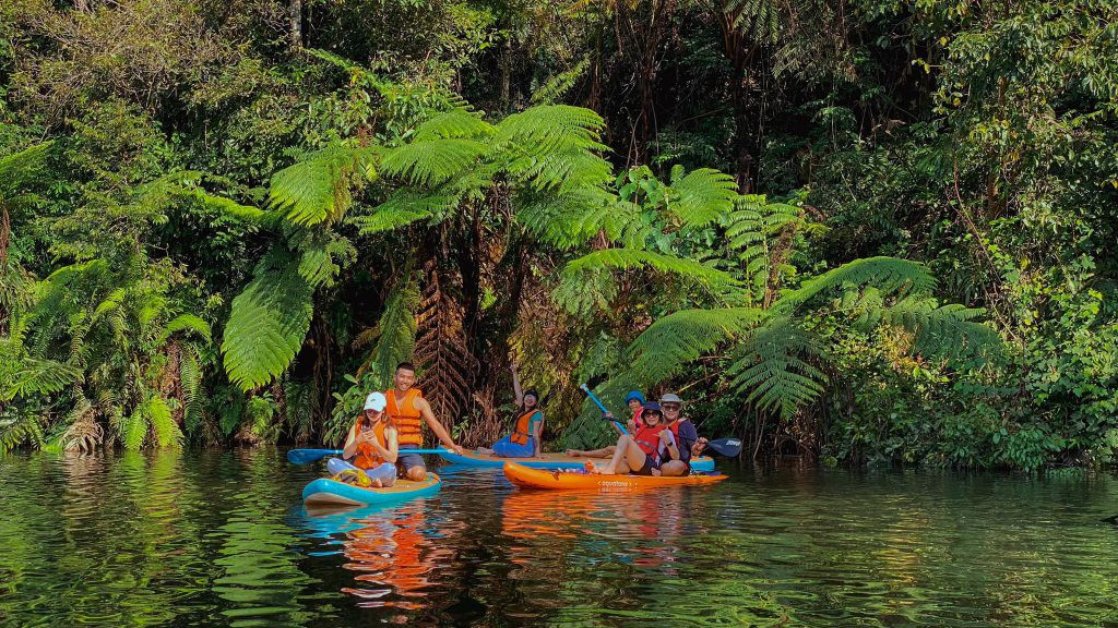Bên cạnh đó, hoạt động chèo SUP trên dòng nước suối trong xanh là một trải nghiệm mới lạ và hấp dẫn. Bạn có thể chèo thuyền, tắm suối mát lạnh hoặc đơn giản là ngồi thư giãn tại những chòi lá ven thác, vừa thưởng thức đặc sản núi rừng vừa đắm mình trong không gian thiên nhiên tuyệt đẹp.