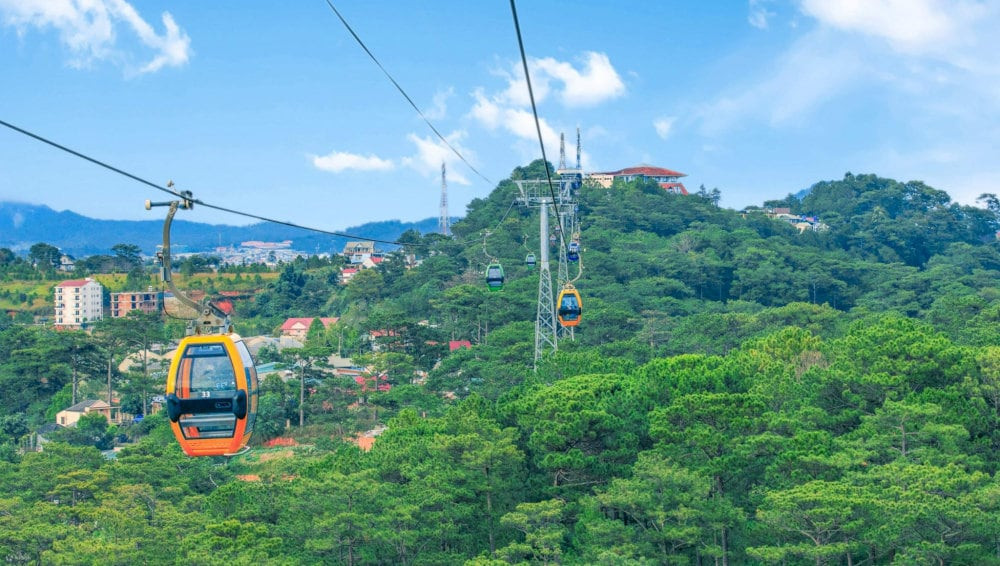 Một trong những cách di chuyển độc đáo và được yêu thích nhất để lên Thiền viện Trúc Lâm là trải nghiệm cáp treo từ đồi Robin. Tuyến cáp treo này không chỉ giúp bạn tiết kiệm thời gian mà còn mang đến cơ hội ngắm nhìn toàn cảnh Đà Lạt từ trên cao. Từ cabin cáp treo, bạn sẽ được chiêm ngưỡng rừng thông bạt ngàn, hồ Tuyền Lâm yên ả và những áng mây lững lờ trôi, tạo nên một khung cảnh kỳ vĩ và thơ mộng. Giá vé cáp treo tham khảo là 100.000 VNĐ/người lớn (hai chiều) và 80.000 VNĐ/người lớn (một chiều), với mức giá ưu đãi hơn cho trẻ em dưới 1m2. Đây là một trải nghiệm không thể bỏ qua khi tìm hiểu thiền viện Trúc Lâm ở đâu và đến thăm nơi này.