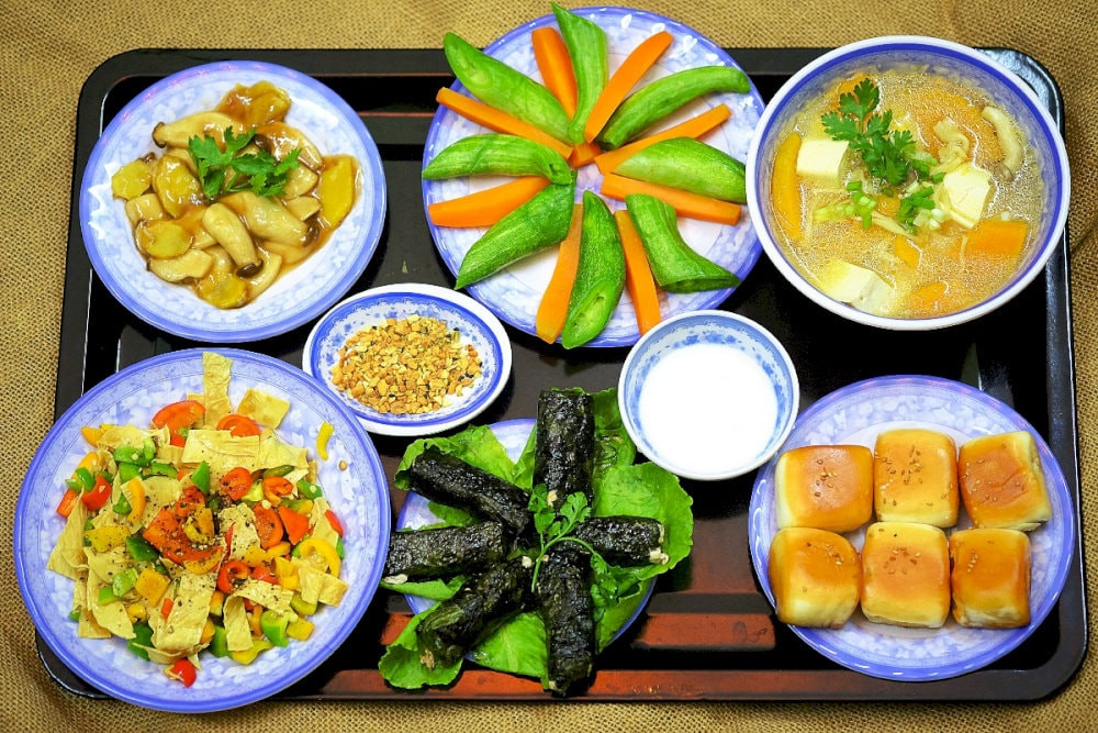 Một phần không thể thiếu trong trải nghiệm tại Thiền viện Trúc Lâm là thưởng thức ẩm thực chay. Vào các dịp lễ lớn, ngày Rằm hoặc khi tham gia khóa tu, du khách có cơ hội nếm thử những món ăn chay tinh tế, được chế biến từ nguyên liệu tươi ngon, thanh đạm. Các món ăn như cơm chiên nấm, đậu hũ muối chiên, canh chua chay… không chỉ ngon miệng, bổ dưỡng mà còn mang ý nghĩa về sự thanh khiết, giản dị của đời sống thiền môn. Hương vị nhẹ nhàng của những món ăn này góp phần làm trọn vẹn hơn hành trình tìm về bình yên của bạn tại đạo tràng tâm linh Trúc Lâm.