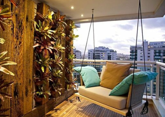 Thiết kế ban công chung cư nhỏ đẹp chỉ với một chiếc xích đu đệm cạnh bức tường gỗ ốp cây xanh, tạo điểm nhấn ấn tượng.