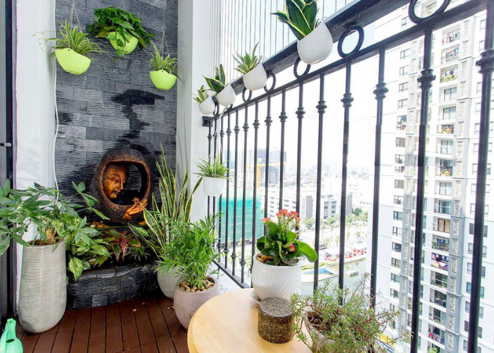 Việc bố trí tiểu cảnh cũng là một giải pháp tuyệt vời để mang hơi thở thiên nhiên vào ban công chung cư. Bạn có thể cân nhắc một hồ cá mini, hòn non bộ nhỏ, hoặc đơn giản là một vài chậu bonsai được sắp xếp nghệ thuật. Những yếu tố này không chỉ tăng tính thẩm mỹ mà còn có thể mang ý nghĩa phong thủy, tạo sự hài hòa và may mắn cho gia chủ.