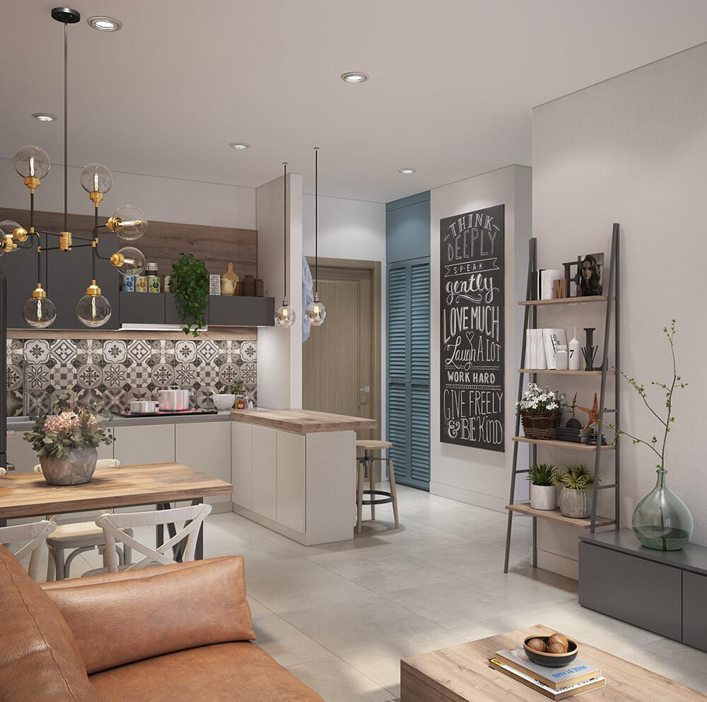 Phong cách Scandinavian mang đến sự ấm cúng, gần gũi với thiên nhiên và đầy đủ ánh sáng, rất phù hợp với thiết kế căn hộ mini 100m2. Các yếu tố chính bao gồm sử dụng vật liệu gỗ tự nhiên (gỗ sáng màu), màu sắc tươi sáng (trắng, xanh nhạt), kết hợp với các vật liệu dệt như len, cotton. Ánh sáng tự nhiên được tận dụng tối đa, và các cây xanh nhỏ cũng thường được đưa vào để tạo điểm nhấn, mang lại cảm giác thư thái và trong lành cho căn hộ.