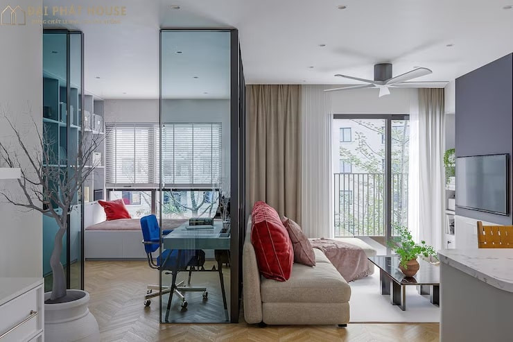 Phòng khách là bộ mặt của căn hộ và cần được ưu tiên sự thoải mái, thông thoáng. Với diện tích hạn chế, việc sử dụng sofa giường là một giải pháp thông minh để tiết kiệm không gian và tăng thêm công năng. Kết hợp với kệ tivi đa năng có nhiều ngăn kéo hoặc hộc tủ sẽ giúp bạn lưu trữ đồ đạc gọn gàng. Cửa sổ lớn không chỉ mang lại ánh sáng tự nhiên dồi dào mà còn tạo cảm giác rộng rãi và kết nối với không gian bên ngoài. Thêm một vài gối tựa hoặc thảm trải sàn nhỏ để tăng thêm sự ấm cúng và cá tính cho căn phòng.