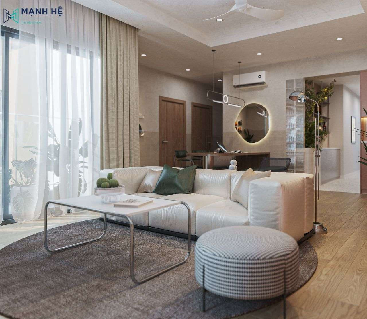 Căn hộ 65m2 cho phép sự thoải mái hơn trong việc lựa chọn nội thất và bố cục. Một phòng khách rộng rãi hơn, khu vực ăn uống riêng biệt hoặc một ban công nhỏ xinh có thể được tận dụng tối đa. Thiết kế nội thất chung cư 2 phòng ngủ ở diện tích này có thể kết hợp thêm cây xanh, tranh ảnh nghệ thuật để tạo điểm nhấn. Việc phân chia không gian bằng vách ngăn nhẹ hoặc kệ trang trí sẽ giúp căn hộ có sự riêng tư mà vẫn giữ được sự liền mạch.
