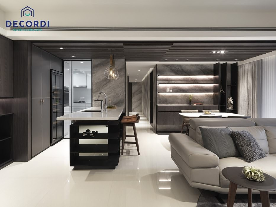 Phòng khách liền bếp hiện đại với tone xám trong thiết kế chung cư 75m2