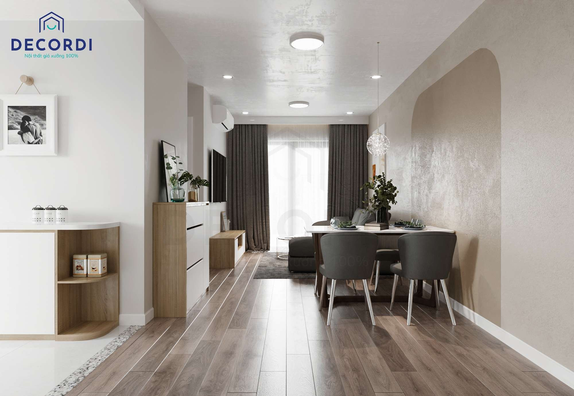 Thiết kế phòng khách tối giản với nội thất gỗ công nghiệp cho chung cư 75m2