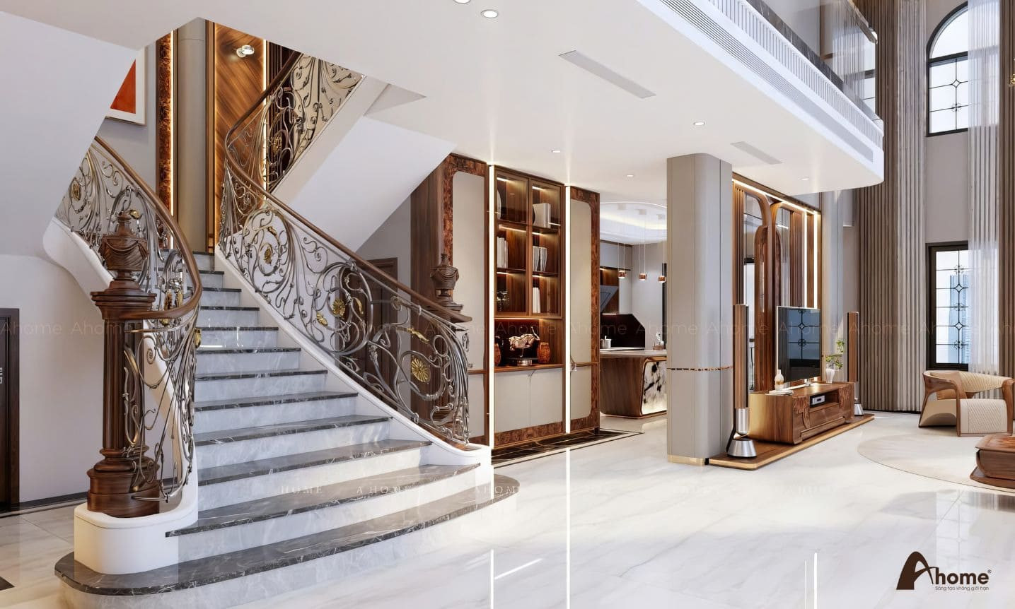 Phòng khách có thể được thiết kế thông tầng ấn tượng với sofa vòng cung sang trọng, bàn trà gỗ nguyên khối độc đáo, được chiếu sáng bởi đèn chùm nghệ thuật, tạo nên một không gian vừa bề thế vừa tinh tế. Các vật liệu đắt giá như đá tự nhiên và kim loại cao cấp được sử dụng rộng rãi để thể hiện sự xa xỉ.