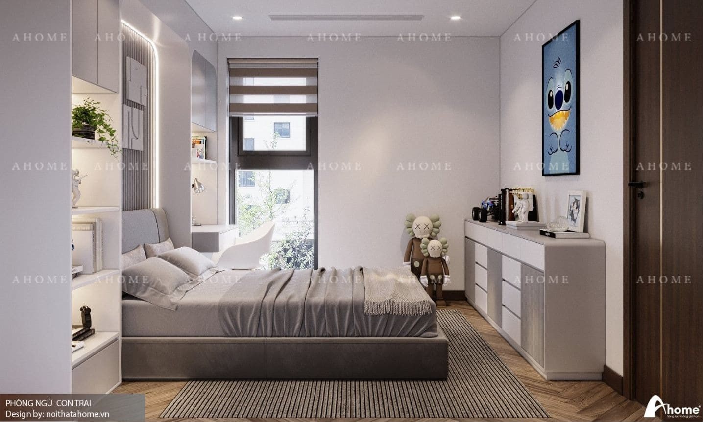 Phòng ngủ sẽ được thiết kế ấm cúng, tiện nghi với giường gỗ, chăn nệm êm ái và hệ thống tủ kệ tích hợp TV cùng giá sách lớn, biến phòng ngủ thành không gian đa năng để nghỉ ngơi và làm việc.
