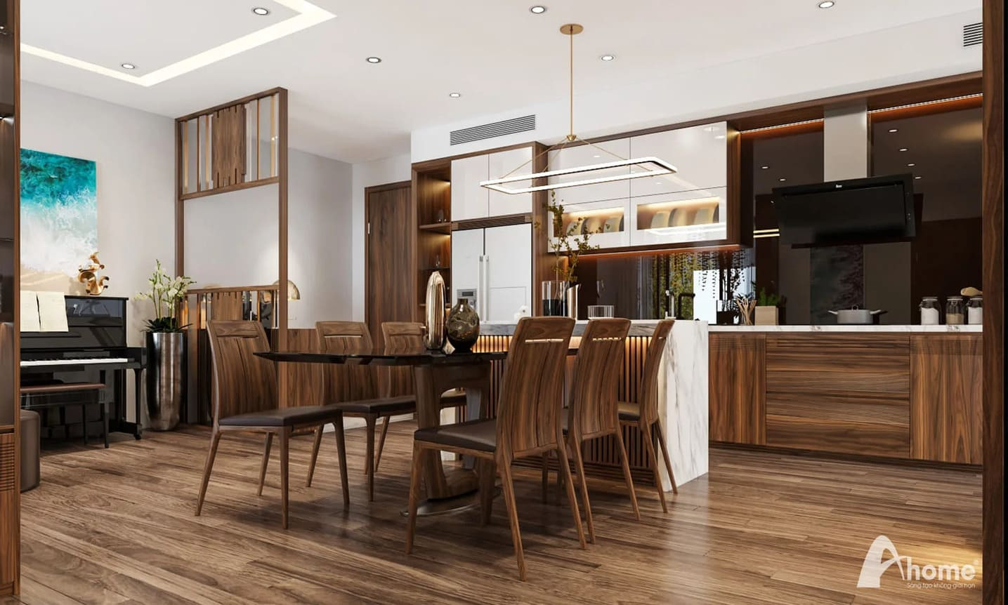 Phòng khách và khu vực ăn uống có thể được phân tách khéo léo bằng vách trang trí hoặc tủ kệ thấp, tạo ra sự ngăn cách cần thiết nhưng vẫn duy trì dòng chảy thông suốt của không gian. Vật liệu cao cấp như gỗ óc chó nhập khẩu cho đồ nội thất chính và kính cường lực cho vách ngăn sẽ khẳng định đẳng cấp.