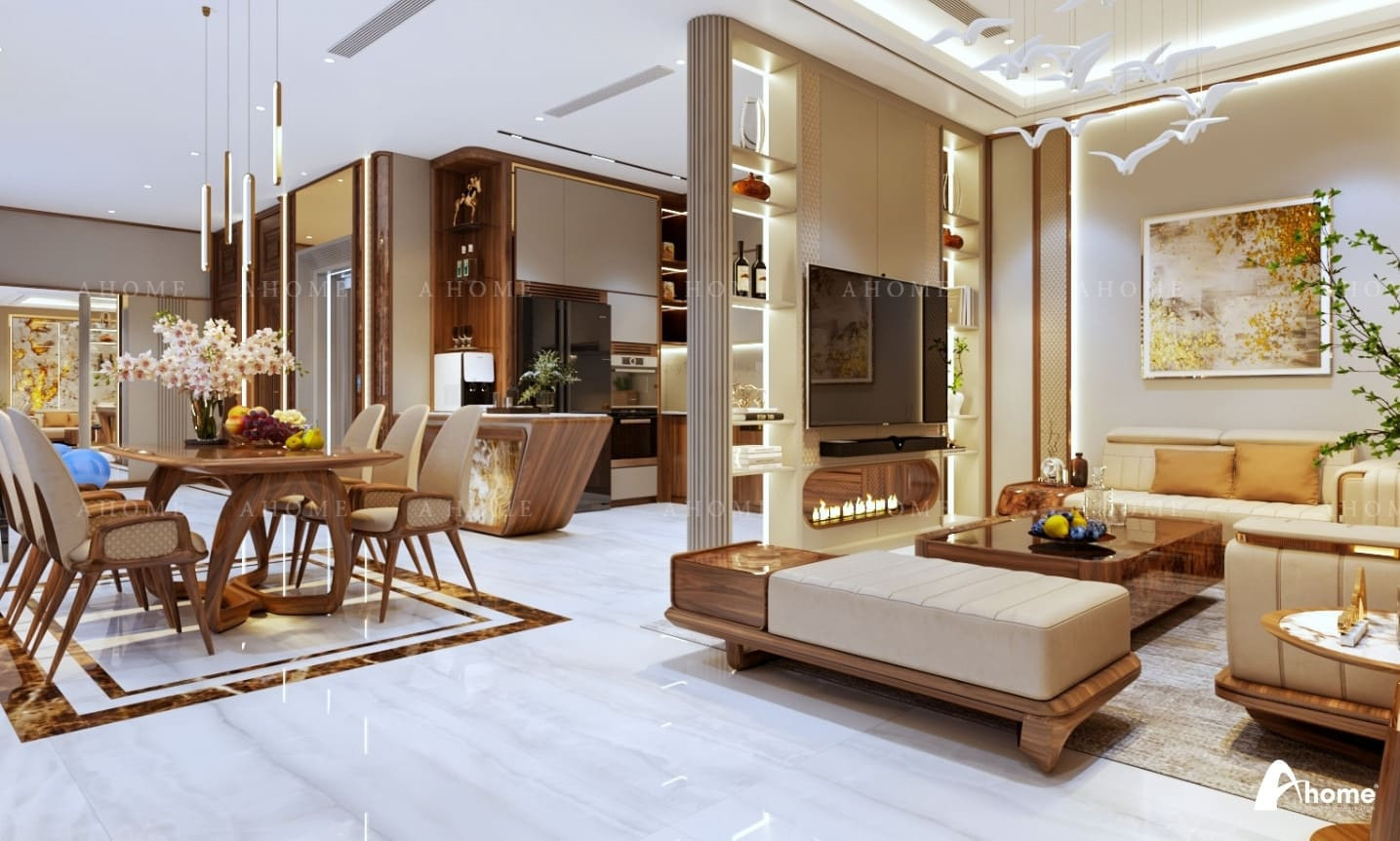 Đồ đạc có đường nét cong mềm mại, chi tiết trang trí tinh xảo như phào chỉ, hoa văn chạm khắc tạo nên dấu ấn nghệ thuật cao cấp. Không gian mở giữa phòng khách và bếp với đảo bếp lớn không chỉ tăng tính kết nối mà còn nâng cao sự tiện lợi khi sử dụng.