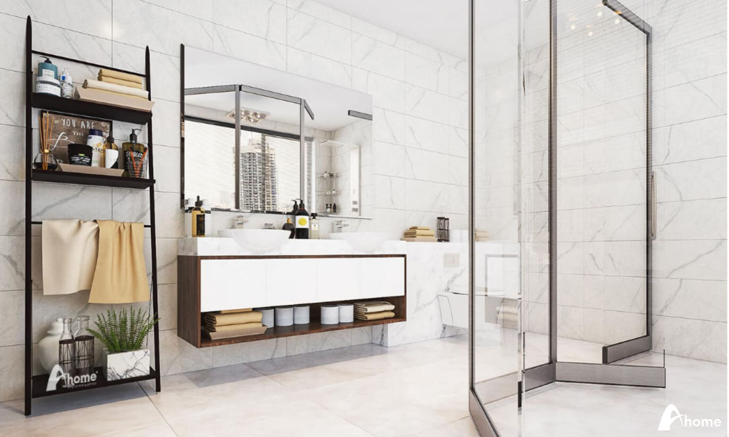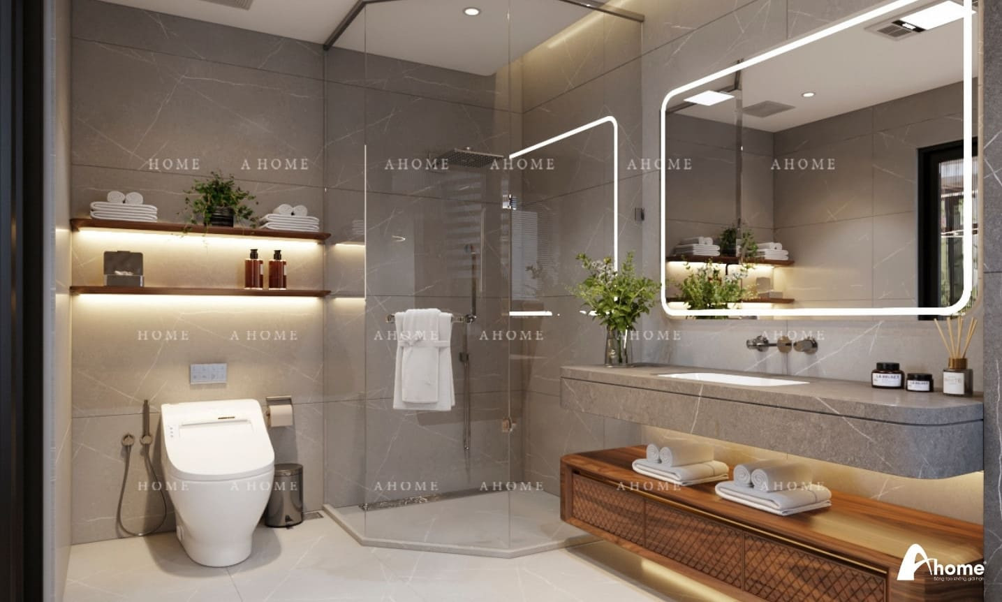 Phòng tắm không chỉ là nơi vệ sinh mà còn là không gian thư giãn cá nhân. Cần tối ưu không gian lưu trữ bằng cách sử dụng kệ treo tường, tủ gương tích hợp đèn LED thay vì tủ đặt sàn chiếm diện tích.