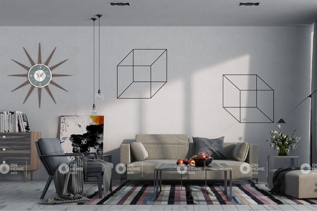Dù diện tích hạn chế, việc trang trí và tạo điểm nhấn vẫn rất cần thiết để cá tính hóa không gian phòng khách chung cư 70m2. Tuy nhiên, cần tiết chế và chọn lọc. Một bức tranh nghệ thuật lớn, một chiếc gương trang trí độc đáo hoặc một mảng tường nhấn với giấy dán tường họa tiết là những cách hiệu quả để tạo điểm nhấn mà không chiếm quá nhiều diện tích.