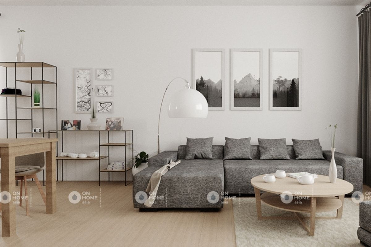 Khô ng gian phò ng khách căn hộ 70m2 phong cách tối giảnAlt: Không gian phòng khách chung cư 70m2 tối giản, sử dụng gam màu trắng và xám, tối ưu ánh sáng.