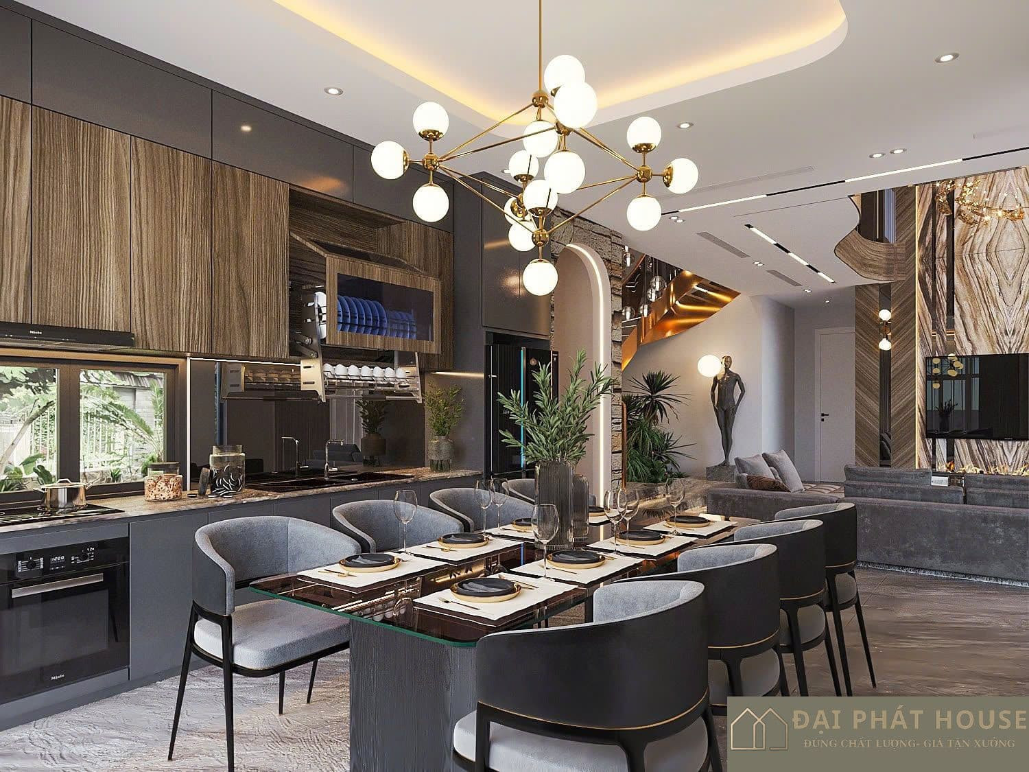 - Phòng bếp: Tập trung vào tính thẩm mỹ và công năng sử dụng, với hệ tủ bếp, đảo bếp và khu vực ăn uống được sắp xếp khoa học, tiện lợi.