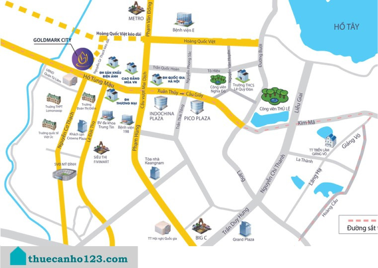 Cụ thể, vị trí của Goldmark City tiếp giáp với nhiều tuyến đường quan trọng. Phía Đông kết nối trực tiếp với trục Xuân Thủy – Cầu Giấy, giúp việc di chuyển vào các quận nội thành lân cận trở nên dễ dàng. Phía Tây nối liền với trục đường 32, thuận tiện cho cư dân khám phá các làng nghề truyền thống và danh lam thắng cảnh. Phía Nam giáp đường Lê Đức Thọ, dẫn thẳng ra Sân vận động Mỹ Đình hoặc theo hướng Phạm Hùng – Vành Đai 3 để đến Bến xe Mỹ Đình và Trung tâm Hội nghị Quốc gia. Cuối cùng, phía Bắc dự án kết nối với trục đường Phạm Văn Đồng, thuận tiện đi Sân bay Nội Bài.