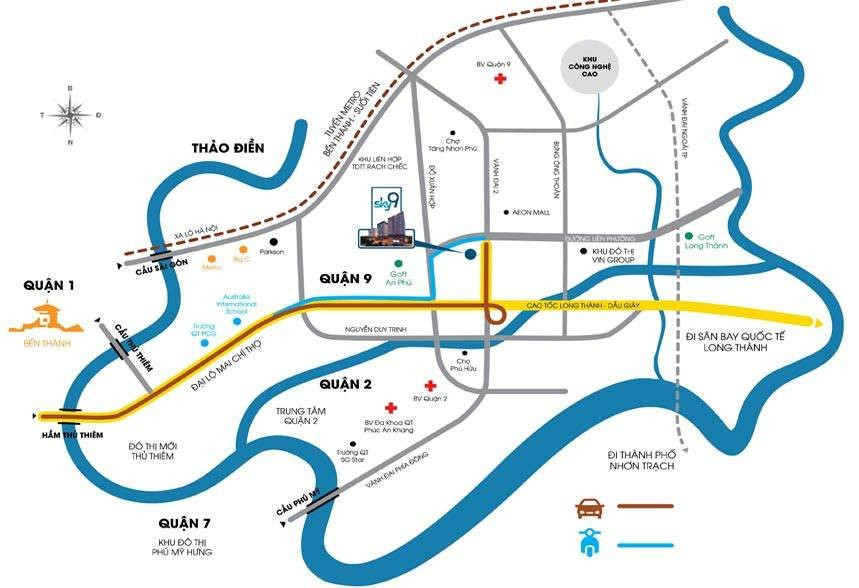 Dự án nằm liền kề với tuyến đường cao tốc Long Thành – Dầu Giây và chỉ cách Khu Công nghệ cao TP.HCM vài phút di chuyển, nơi tập trung nhiều tập đoàn công nghệ lớn như Samsung CE Complex, Intel. Bên cạnh đó, sự hiện diện của trường Đại học Fulbright Việt Nam và các khu dân cư compound sang trọng như Mega, Melosa Garden, Villa Park, Lucasta cũng góp phần nâng tầm giá trị và mang đến những tiện ích sẵn có xung quanh căn hộ Sky 9.