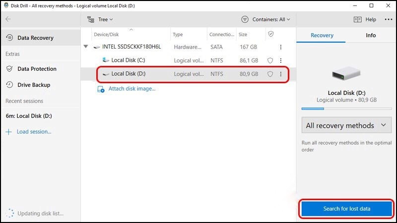 Chọn ổ đĩa cần quét để tìm kiếm file đã xóa khỏi thùng rác máy tính bằng Disk Drill