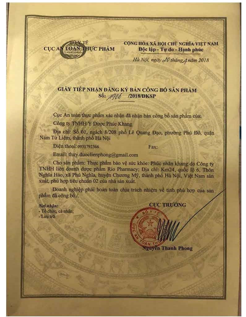 Phúc Nhãn Khang là sản phẩm đã được Bộ Y Tế Việt Nam cấp phép lưu hành, với Số giấy tiếp nhận đăng ký bản công bố sản phẩm là 1906/2018/ĐKSP và Số giấy xác nhận nội dung quảng cáo số 2590/2020/XNQC-ATTP. Điều này chứng tỏ sản phẩm đã trải qua quá trình kiểm định nghiêm ngặt về chất lượng và an toàn vệ sinh thực phẩm. Các thông tin về thành phần và công dụng đều được công khai, minh bạch.