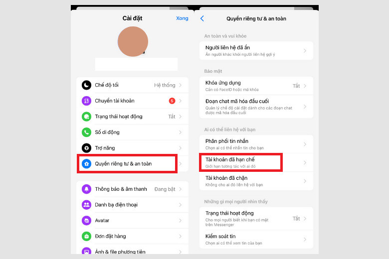 Chọn mục quyền riêng tư và an toàn để truy cập danh sách tài khoản đã hạn chế trên Messenger
