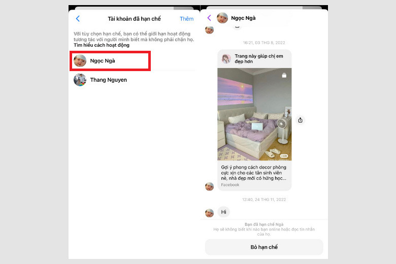 Một danh sách đầy đủ các tài khoản mà bạn đã áp dụng chế độ hạn chế tin nhắn sẽ xuất hiện. Từ danh sách này, bạn chỉ cần chọn tài khoản mà mình muốn xem lại tin nhắn. Ngay lập tức, bạn sẽ được đưa đến cuộc trò chuyện với người đó, nơi bạn có thể đọc tất cả các tin nhắn mà họ đã gửi mà không cần phải gỡ bỏ hạn chế. Nếu bạn muốn tương tác lại hoặc bỏ hạn chế, nút “Bỏ hạn chế” sẽ hiển thị ở cuối màn hình để bạn dễ dàng thao tác.