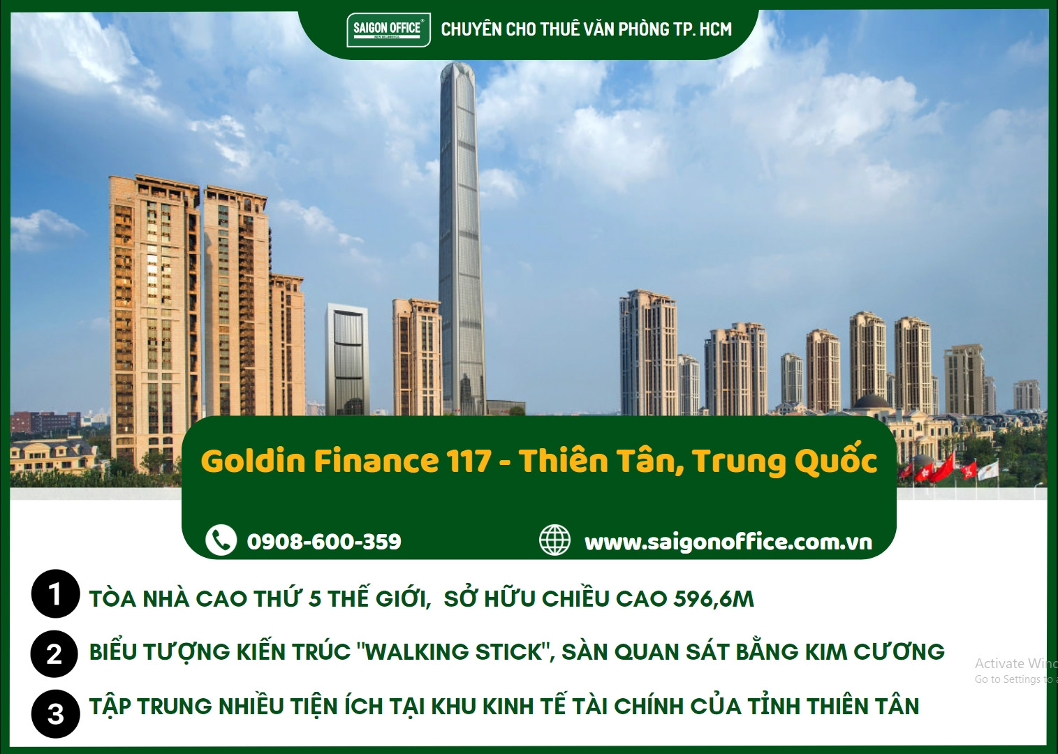 Goldin Finance 117, một tòa nhà chọc trời nổi bật được xây dựng tại khu kinh tế tài chính của tỉnh Thiên Tân, đã khởi công từ năm 2008 và dự kiến hoàn thành vào năm 2015. Công trình này hiện được xếp hạng là tòa nhà cao thứ ba tại Trung Quốc và thứ năm trên thế giới, với chiều cao ấn tượng lên đến 596,6 mét. Được biết đến với biệt danh “Walking Stick” (Hành lang Đi bộ) do hình dáng độc đáo của mình, tháp Goldin Finance 117 kết hợp giữa không gian văn phòng hiện đại và khách sạn sang trọng, với điểm nhấn là sàn quan sát bằng kim cương mang đến trải nghiệm ngắm cảnh tuyệt vời.