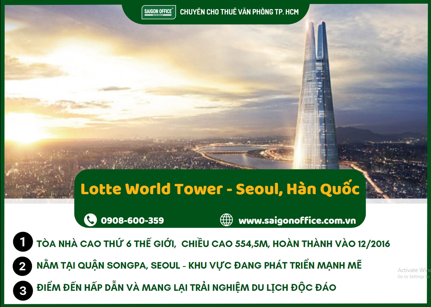 Nằm tại quận Songpa, một khu vực đang phát triển mạnh mẽ của Seoul, Lotte World Tower thu hút hàng triệu lượt du khách từ mọi nơi trên thế giới hàng năm. Với vẻ đẹp lôi cuốn của thiên nhiên, lịch sử sâu sắc và những công trình nổi tiếng, xứ sở Kim Chi luôn biết cách làm cho du khách cảm thấy được chào đón và đắm chìm trong trải nghiệm độc đáo mà họ không thể tìm thấy ở bất kỳ nơi nào khác. Tòa nhà này không chỉ là một biểu tượng kiến trúc mà còn là một trung tâm phức hợp đa dạng, bao gồm khu mua sắm cao cấp, khách sạn sang trọng, văn phòng, và đài quan sát “Seoul Sky” – một trong những đài quan sát cao nhất thế giới, mang đến tầm nhìn toàn cảnh Seoul đầy ấn tượng.
