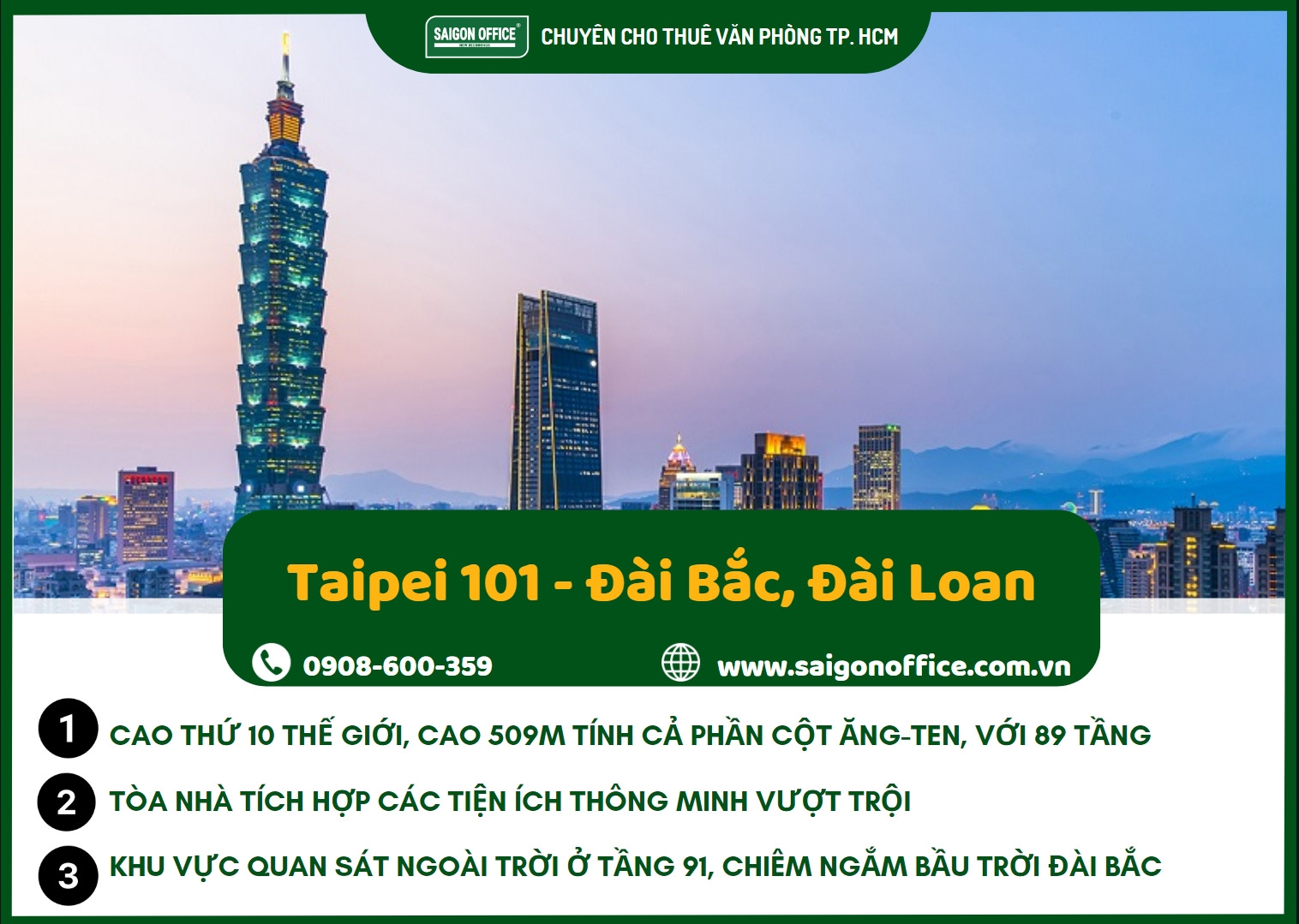 Taipei 101 là một công trình kiến trúc độc đáo và đáng tự hào của Đài Loan, nằm giữa lòng thành phố Đài Bắc với chiều cao lên đến 449,2 mét tính đến mái và 509 mét tính cả phần cột ăng-ten trên tòa nhà. Với 89 tầng, tháp này mang lại một cái nhìn toàn cảnh tuyệt vời về thành phố Đài Bắc từ bên trong. Sự tiện ích của tòa nhà được thể hiện qua việc trang bị tới 61 thang máy, trong đó có 2 thang máy vận hành với tốc độ cực nhanh (1.010 m/phút), giúp du khách di chuyển từ tầng 1 đến tầng 89 chỉ trong khoảng 39 giây, lập kỷ lục thế giới về tốc độ.