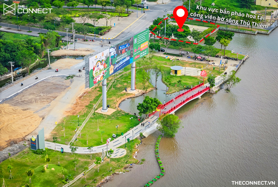 Công viên bờ sông Thủ Thiêm không chỉ là không gian giải trí mà còn là một quảng trường cộng đồng thoáng đãng, nằm ngay sát khu vực bắn pháo hoa tại nóc hầm. Từ đây, bạn có thể tận hưởng góc nhìn bao quát và rõ nét nhất về toàn bộ sự kiện. Không gian xanh mát, cùng với các cảnh quan như cánh đồng hoa hướng dương hoặc đài phun nước, làm tăng thêm vẻ đẹp lung linh của màn pháo sáng.