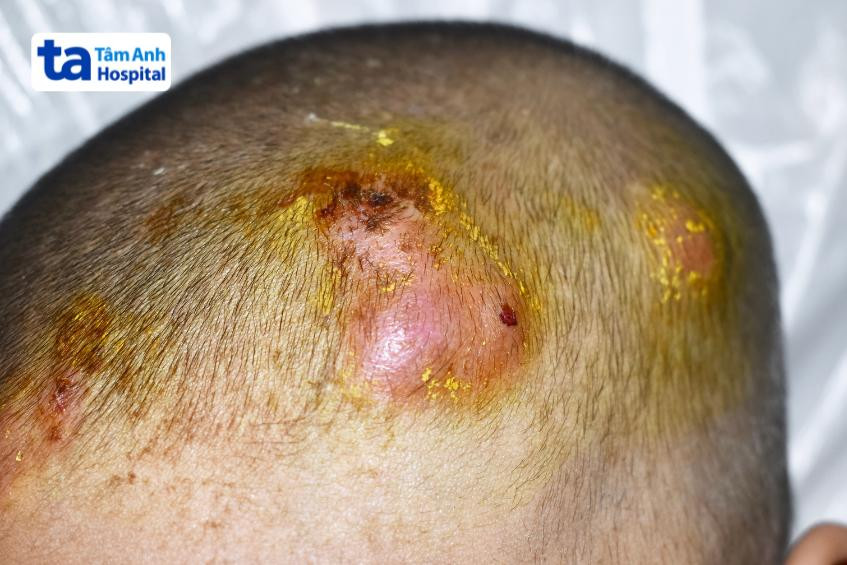 Mụn nhọt lớn trên da đầu bé gây sưng tấy và biến dạng nhẹ vùng da xung quanhMụn nhọt lớn trên da đầu bé gây sưng tấy và biến dạng nhẹ vùng da xung quanh