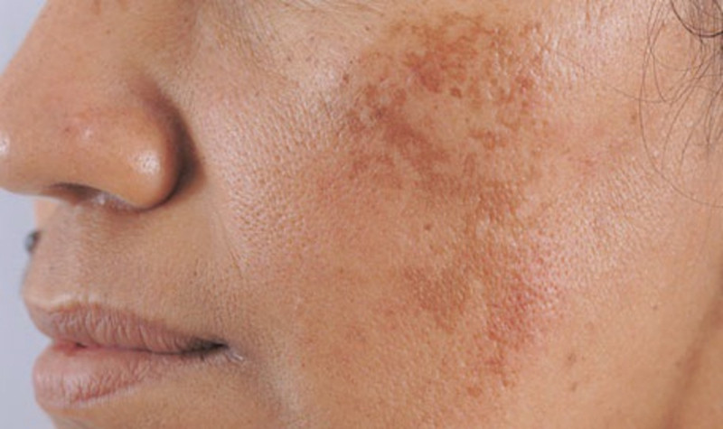 Người bị nám da có những mảng màu nâu trên mặtHình ảnh người bị nám da với các mảng sắc tố đậm màu trên mặt, minh chứng cho sự tăng sản xuất melanin.