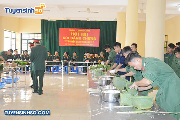 Học viên Trường Sĩ quan Đặc công tham gia gói bánh chưng, một hoạt động văn hóa tại địa điểm trường.