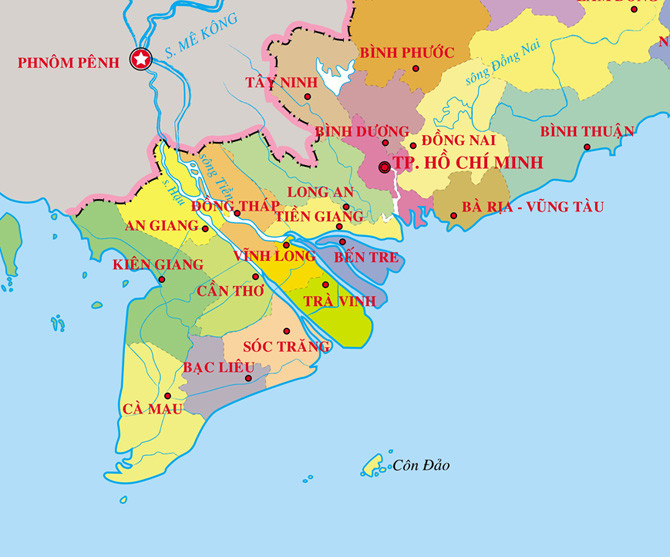 Bản đồ các tỉnh thành miền Nam Việt Nam, trung tâm kinh tế sôi động