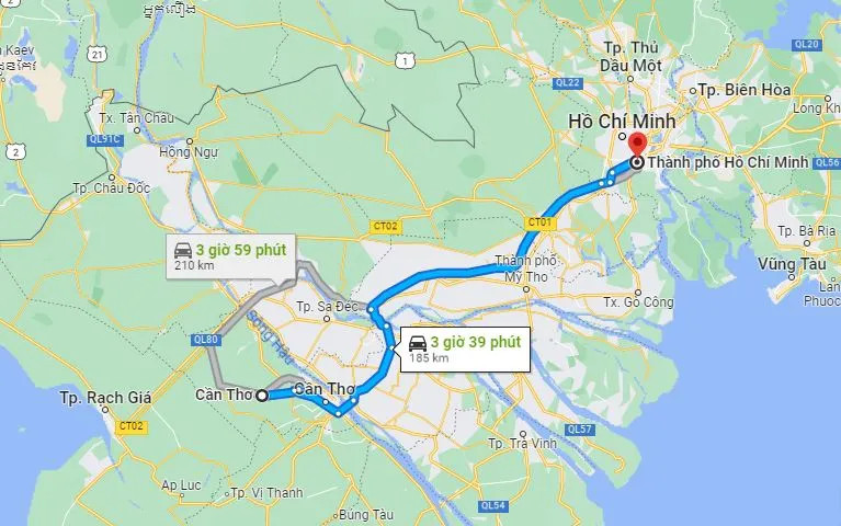 Khoảng cách ngắn nhất từ Cần Thơ đi Sài Gòn (TPHCM) là 185km