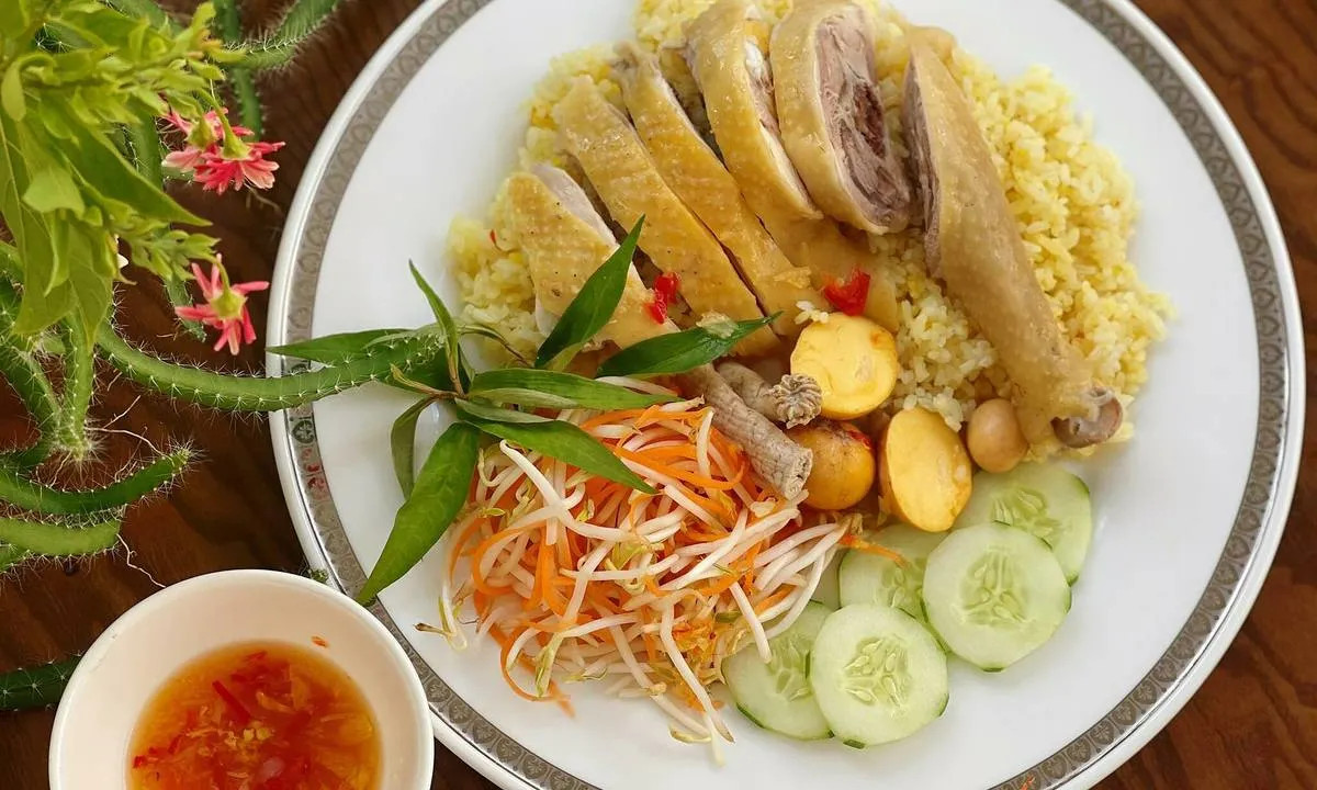 Món cơm gà Phú Yên với hạt cơm vàng óng và thịt gà luộc săn chắc