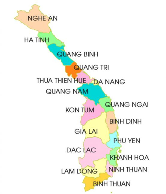 Bản đồ khu vực miền Trung và Tây Nguyên, minh họa các tỉnh thành trên hành trình từ nam ra bắcBản đồ khu vực miền Trung và Tây Nguyên, minh họa các tỉnh thành trên hành trình từ nam ra bắc