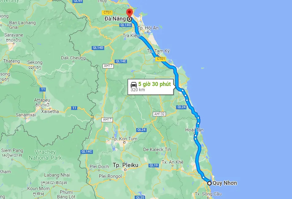 Khoảng cách thực tế từ Quy Nhơn đi Đà Nẵng bao nhiêu km?