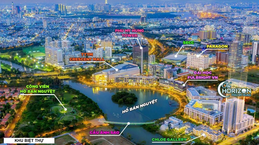 Vị trí dự án The Horizon thực sự là một điểm nhấn chiến lược, khẳng định giá trị “kim cương” trong bản đồ bất động sản Thành phố Hồ Chí Minh. Nằm ngay trung tâm khu Hồ Bán Nguyệt (The Crescent), The Horizon sở hữu tầm nhìn triệu đô hiếm có, trực diện Cầu Ánh Sao và Hồ Bán Nguyệt, hai biểu tượng du lịch và giải trí nổi tiếng của Phú Mỹ Hưng. Đây không chỉ là một địa điểm an cư lý tưởng mà còn là một tài sản có tiềm năng gia tăng giá trị bền vững theo thời gian.
