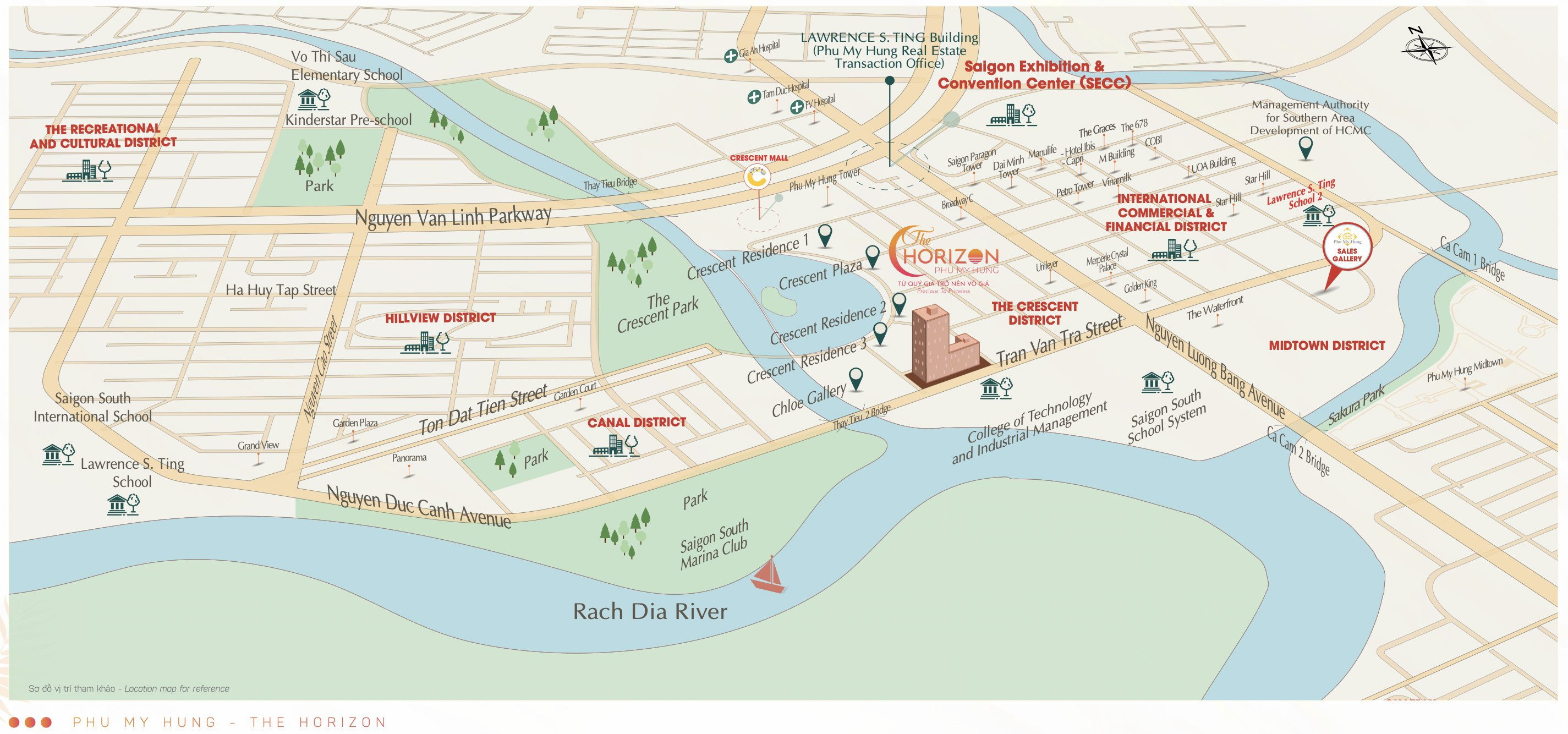 Từ vị trí dự án The Horizon, cư dân chỉ mất vài phút để tiếp cận hàng loạt tiện ích đẳng cấp như Hồ Bán Nguyệt, Cầu Ánh Sao, Crescent Mall, Đại học Fulbright, các trường quốc tế, công viên The Crescent Park, và Trung tâm Hội nghị Triển lãm SECC.