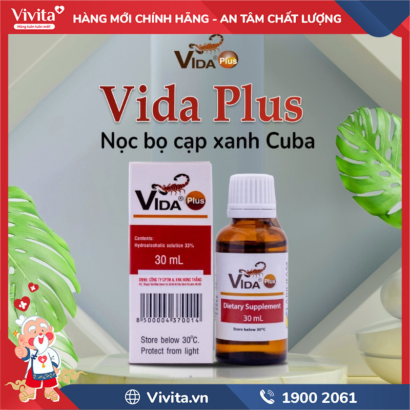 Mỗi 1 ml sản phẩm Vida Plus (tương đương 20 giọt) chứa 33% cồn Hydroalcoholic chiết xuất từ nọc của bọ cạp xanh Rhopalurus junceus. Đây là thành phần cốt lõi tạo nên giá trị đặc biệt của sản phẩm này. Nọc bọ cạp xanh đã được các nhà khoa học nghiên cứu sâu rộng và phát hiện chứa nhiều hoạt chất sinh học quý giá.