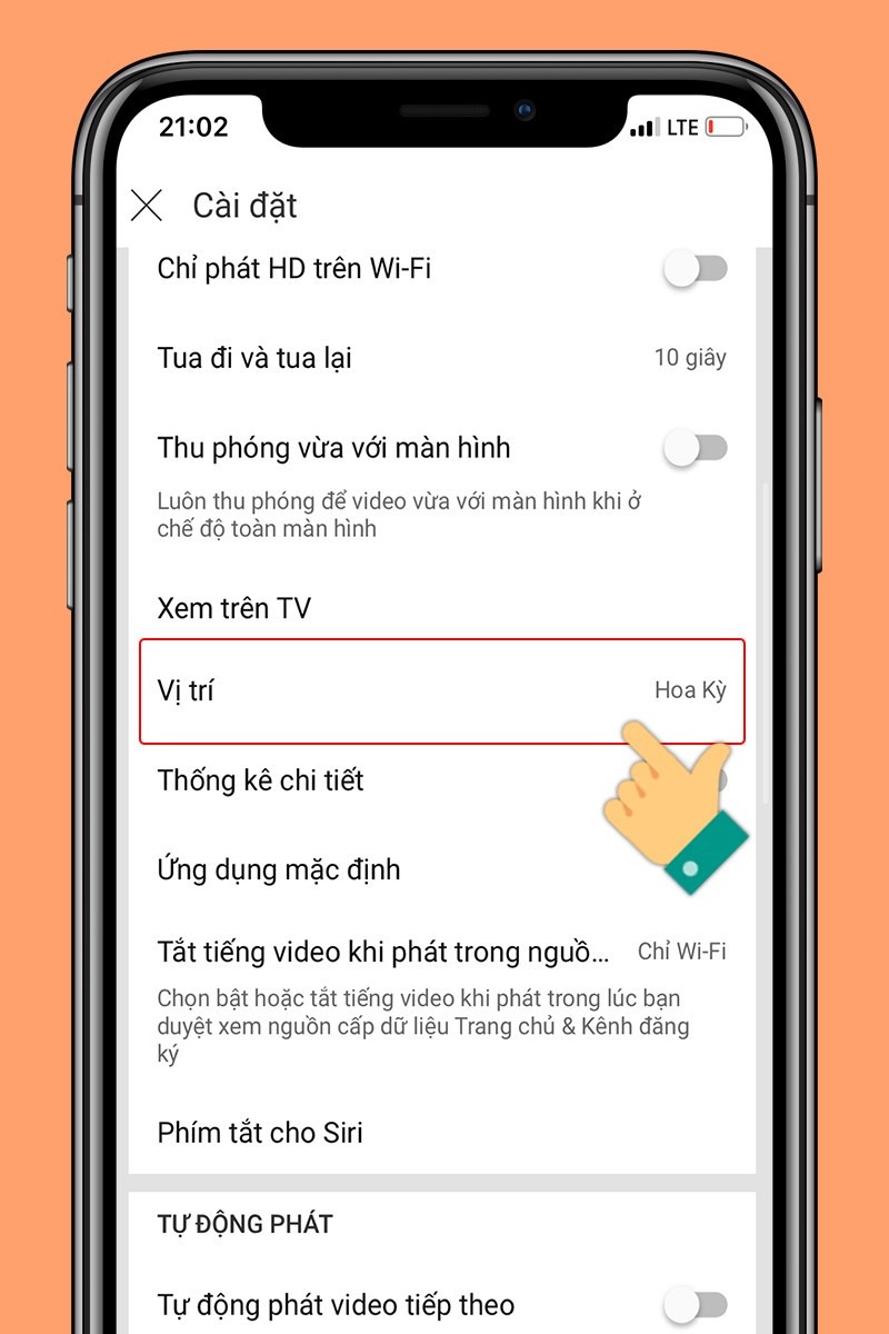 Tiếp theo, trong phần cài đặt, cuộn xuống và tìm mục “Vị trí” (Location). Nhấn vào đây để thay đổi quốc gia mà bạn muốn xem các video thịnh hành YouTube từ đó.